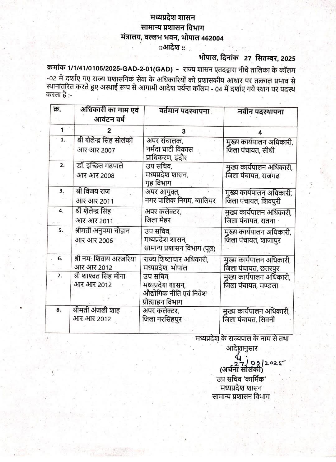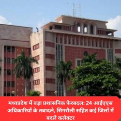 देर रात तबादले: 26 अफसरों का फेरबदल, सीधी को मिले नए जिला पंचायत सीईओ भोपाल। राज्य शासन ने शनिवार की आधी रात को बड़ा प्रशासनिक फेरबदल करते हुए भारतीय प्रशासनिक सेवा (IAS) के 18 और राज्य प्रशासनिक सेवा (SAS) के 8 अधिकारियों के तबादले किए हैं। इन अफसरों को जिला पंचायत सीईओ, अपर कलेक्टर, अपर संचालक और अनुविभागीय अधिकारी राजस्व के पदों पर पदस्थ किया गया है। खास बात यह है कि कई जिलों में जिला पंचायत सीईओ के साथ-साथ अधिकारियों को अपर कलेक्टर का भी अतिरिक्त प्रभार सौंपा गया है। इस फेरबदल से सीधी जिले में भी नए जिला पंचायत सीईओ की नियुक्त हुई है। आदेश के मुताबिक, राज्य प्रशासनिक सेवा के शैलेंद्र सिंह सोलंकी को मुख्य कार्यपालन अधिकारी जिला पंचायत सीधी बनाया गया है। वहीं, गृह विभाग के उप सचिव डॉ. इच्छित गढ़पाले को जिला पंचायत राजगढ़ का सीईओ पदस्थ किया गया है। आईएएस अफसरों के तबादले भारतीय प्रशासनिक सेवा के कई अधिकारियों को नई जिम्मेदारियां सौंपी गई हैं। इनमें संजना जैन को सीईओ जिला पंचायत सतना से हटाकर अपर कलेक्टर मैहर भेजा गया है। जगदीश कुमार गोमे उप सचिव संस्कृति विभाग से सीईओ जिला पंचायत सिंगरौली, हरसिमरन प्रीत कौर को सीईओ जिला पंचायत कटनी और अंजली जोसेफ जोनाथन को सीईओ जिला पंचायत हरदा नियुक्त किया गया है। इसी तरह सोजान सिंह रावत को सीईओ जिला पंचायत नर्मदापुरम से ग्वालियर भेजा गया है। सृष्टि देशमुख गौड़ा को अपर कलेक्टर खंडवा, निधि सिंह को अपर श्रम आयुक्त, हिमांशु जैन को सीईओ जिला पंचायत नर्मदापुरम, सर्जना यादव को सीईओ जिला पंचायत सीहोर, वैशाली जैन को सीईओ जिला पंचायत रतलाम, दिव्यांशु चौधरी को सीईओ जिला पंचायत डिंडोरी और सृजन वर्मा को सीईओ जिला पंचायत बुरहानपुर बनाया गया है। अन्य पदस्थापनाएं अर्चना कुमारी को सीईओ जिला पंचायत अनूपपुर, शिवम प्रजापति को सीईओ जिला पंचायत शहडोल, सौम्या आनंद को सीईओ जिला पंचायत श्योपुर, आकिप खान को एसडीएम पिपरिया (नर्मदापुरम), पंकज वर्मा को एसडीएम पुनासा (खंडवा) और सपना अनुराग जैन को अपर संचालक नर्मदा घाटी विकास प्राधिकरण इंदौर पदस्थ किया गया है। एसएएस अफसरों को भी मिली जिम्मेदारी जिला पंचायत सीधी में शैलेंद्र सिंह सोलंकी के अलावा, विजय राज को सीईओ जिला पंचायत शिवपुरी, शैलेंद्र सिंह को सीईओ जिला पंचायत सतना, अनुपमा चौहान को सीईओ शाजापुर, नमः शिवाय अरजरिया को सीईओ छतरपुर, शाश्वत सिंह मीना को सीईओ मंडला और अंजली शाह को सीईओ जिला पंचायत सिवनी की जिम्मेदारी सौंपी गई है। इस तरह, रातों-रात हुए इस बड़े फेरबदल से प्रदेश के कई जिलों के प्रशासनिक ढांचे में बदलाव हो गया है।
