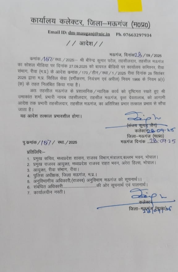 रीवा कमिश्नर ने गालीबाज तहसीलदार वीरेंद्र कुमार पटेल को किया निलंबित, उमाकांत शर्मा को सौंपा गया प्रभार रीवा। मऊगंज जिले के प्रभारी तहसीलदार वीरेंद्र कुमार पटेल को जनता से अभद्र भाषा एवं अशोभनीय आचरण करने के आरोप में रीवा संभागायुक्त ने तत्काल प्रभाव से निलंबित कर दिया है। सोशल मीडिया पर वायरल वीडियो बना कार्रवाई का आधार 27 सितंबर को तहसीलदार पटेल का एक वीडियो सोशल मीडिया पर तेजी से वायरल हुआ, जिसमें वे ग्राम गनिगवां, वृत्त देवतालाब निवासी एक व्यक्ति से न केवल गाली-गलौज कर रहे थे, बल्कि उसका कॉलर पकड़कर अमर्यादित व्यवहार भी कर रहे थे। कलेक्टर मऊगंज ने इस मामले की रिपोर्ट क्रमांक 495/स्टेनो/2025 दिनांक 27.09.2025 के माध्यम से संभागायुक्त को भेजी। रिपोर्ट में इसे *म.प्र. सिविल सेवा (आचरण) नियम 1965 के नियम 3* का उल्लंघन और गंभीर कदाचार बताया गया। कमिश्नर का आदेश प्रस्ताव पर कार्रवाई करते हुए कमिश्नर रीवा ने आदेश क्रमांक 170/तीन/स्था./1/2025 दिनांक 28.09.2025 जारी कर पटेल को *म.प्र. सिविल सेवा (वर्गीकरण, नियंत्रण एवं अपील) नियम 1966 के नियम 9(1)(क)* के तहत तत्काल प्रभाव से निलंबित कर दिया। निलंबन अवधि में उनका मुख्यालय कलेक्टर कार्यालय, मऊगंज नियत किया गया है। इस दौरान वे जीवन निर्वाह भत्ते के पात्र रहेंगे। उमाकांत शर्मा को सौंपा गया प्रभार निलंबन के बाद प्रशासनिक और न्यायिक कार्य प्रभावित न हों, इसके लिए प्रभारी नायब तहसीलदार, मऊगंज (वृत्त देवतालाब) उमाकांत शर्मा को तहसीलदार, मऊगंज का अतिरिक्त प्रभार तत्काल प्रभाव से सौंपा गया है। सख्त संदेश कमिश्नर ने आदेश में स्पष्ट लिखा है कि *जनता से अभद्र और अमर्यादित व्यवहार किसी भी कीमत पर बर्दाश्त नहीं किया जाएगा।* यह कार्रवाई प्रदेश भर के राजस्व अधिकारियों के लिए एक कड़ा संदेश मानी जा रही है।